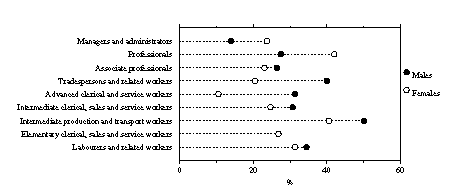 The largest decrease for any two-year period was recorded between 1992 and 1994 (five percentage points), with the 1986-88 and 1994-96 periods recording decreases of four percentage points. The smallest decrease recorded was for 1990-92 at one percentage point. For both males and females there was a four percentage point drop between 1986 and 1988. While union membership remained steady at 35% between 1988 and 1992 for females, membership levels fell three percentage points for males (from 46% to 43%) over the same period. From 1992, a marked fall in membership levels was apparent for both males and females. PROPORTION OF ALL EMPLOYEES WHO WERE TRADE UNION MEMBERS, AUGUST 1986 TO AUGUST 1996 Membership in the public sector decreased from 67% in 1990 to 55% in 1996. For private sector employees the rate declined from 31% in 1990 to 24% in 1996. Between 1992 and 1996, membership levels fell nine percentage points to 35%, and for part-time employees three percentage points to 22%. The mining industry recorded the largest decrease in membership levels (falling 24 percentage points to 39% between 1990 and 1996), while retail trade recorded the smallest decrease over the same period (two percentage points to 23%). Age of members In August 1996, employees aged 55-59 years had the highest rate of trade union membership (39%). The highest rate for part-time employees was recorded for employees aged 35-44 years (26%), whilst for full-time employees the highest rate was recorded for employees aged 55-59 years (45%). State/Territory membership In August 1996, Tasmania had the highest level of trade union membership at 39%, followed by South Australia with 35%. The Northern Territory had the lowest membership rate at 23%. Industry In August 1996, the highest rates of trade union membership were recorded in the Electricity, gas and water supply industry (70% of male employees and 38% of female employees) and the Communication services industry (68% of male employees and 50% of female employees). The lowest rates of trade union membership were recorded in the Agriculture, forestry and fishing industry (7% of male employees and 5% of female employees), Property and business services (13% of male employees and 9% of female employees) and the Wholesale trade industry divisions (17% of male employees and 9% of female employees). PROPORTION OF ALL EMPLOYEES WHO WERE TRADE UNION MEMBERS AND SELECTED INDUSTRIES, AUGUST 1996 A higher proportion of male employees were trade union members (34%) than females (28%). The difference was most marked in the Mining industry (39 percentage points) and least apparent in the Health and community services (less than one percentage point) and Education industries (2 percentage points). In August 1996, the highest level of trade union membership was recorded for the occupation group Intermediate production and transport workers, (e.g. plant and machine operators) where 49% were members (50% of males and 41% of females). The lowest level was recorded for the Advanced clerical and service workers occupation, where 13% of employees were members (31% of males and 11% of females). Males recorded a higher rate of trade union membership than females in all occupations except Managers and administrators (24% of males and 14% of females) and Professionals (42% and 28% respectively). PROPORTION OF ALL EMPLOYEES WHO WERE TRADE UNION MEMBERS AND OCCUPATION, AUGUST 1996 Full-time or part-time status Some 35% of full-time employees and 22% of part-time employees were trade union members. Male full-time employees reported slightly higher rates of trade union membership (36%) than female employees (32%). This pattern was reversed for part-time employees (23% for females, 18% for males), reflecting the relatively high proportion of female part-time employees. Permanent or casual employee Permanent employees were more likely to be trade union members than casual employees (37% compared with 13%). A similar proportion of full-time permanent employees (37%) and part-time permanent employees (38%) were members of a trade union. Of casual employees, 11% of full-timers and 14% of part-timers were trade union members. Sector The public sector had a markedly higher union membership rate at 55% than the private sector at 24%. In both the public and the private sectors, males reported higher union membership levels at 61% (public) and 27% (private) than females, at 50% and 21% respectively. STANDARD EMPLOYMENT BENEFITS In August 1996, 97% of full-time employees and 69% of part-time employees received standard employment benefits such as superannuation, sick leave, holiday leave or long-service leave in their main job. Public sector employees (96%) were more likely to receive standard benefits than their private sector (87%) counterparts. Associate professionals (such as science, engineering and business professionals) were most likely to receive standard benefits (95%). Employees in the Elementary clerical, sales and service workers occupation group were least likely to receive standard benefits (74%). Males (91%) were more likely to receive a standard benefit than females (87%). The lowest receipt of standard benefits was recorded for the youngest and oldest age groups. Some 63% of males aged 15-19 years received a standard benefit compared to 51% of females in the same age group. For males aged 65 years and over 60% received a standard benefit whilst females in the same age group recorded 42%. PROPORTION OF ALL EMPLOYEES WHO RECEIVED STANDARD EMPLOYMENT BENEFITS BY AGE GROUP, AUGUST 1996 Document Selection These documents will be presented in a new window.