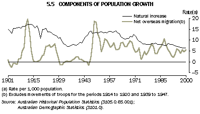 Population growth Population growth results from natural increase and net overseas migration (net permanent and long-term arrivals and departures plus an adjustment for category jumping). Australia's population grew from 3.8 million at the turn of the century to 19.2 million in 2000. During the 1950s Australia experienced consistently high rates of growth, with an average annual increase of 2.4% from the beginning of 1950 to the end of 1959, while during the 1930s Australia experienced relatively low growth (0.9%). Natural increase has been the main source of the growth since the turn of the century, contributing two-thirds of the total increase between 1901 and 2000. Net overseas migration, while a significant source of growth, is more volatile, fluctuating under the influence of government policy as well as political, economic and social conditions in Australia and the rest of the world. The yearly growth rates due to natural increase and net overseas migration from 1901 to 2000 are shown in graph 5.5. In 1901 the rate of natural increase was 14.9 persons per 1,000 population. Over the next four decades the rate increased (to a peak of 17.4 per thousand population in the years 1912, 1913 and 1914) then declined (to a low of 7.1 per thousand population in 1934 and 1935). In the mid to late 1940s the rate increased sharply as a result of the beginning of the baby boom and the immigration of many young people who then had children in Australia, with a plateau of rates of over 13.0 persons per 1,000 population for every year from 1946 to 1962. Since 1962, falling fertility has led to a fall in the rate of natural increase. In 1971 the rate of natural increase was 12.7 persons per 1,000 population; a decade later it had fallen to 8.5. In 1996 the rate of natural increase fell below seven for the first time, with the downward trend continuing in the late 1990s. ABS population projections indicate that continued low fertility, combined with the increase in deaths from an ageing population, will result in natural increase falling below zero sometime in the mid 2030s. Since 1901, the crude death rate has fallen from about 12.2 deaths per 1,000 population to 6.7 in 2000. Crude birth and death rates from 1901 to 2000 are shown in graph 5.6.