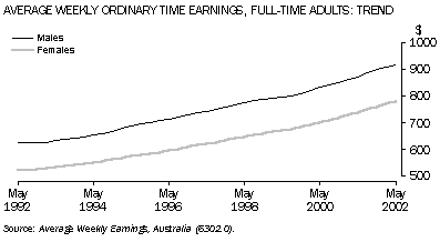 In May 2002, trend average weekly ordinary time earnings for full-time adult employees was $868.50. The figure for males was $920.30 and the figure for females was $778.30. During the period May 2001 to May 2002, male full-time adult average ordinary time earnings increased by 5.4%, while the corresponding estimate for females increased by 5.3%. Both series have increased steadily throughout most of the last ten years.