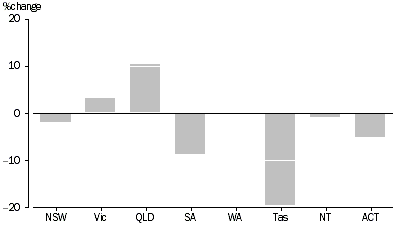 Over the decade Queensland's real GSP in 1992-93 recovered strongly, recording a 7.2% increase in growth. Australia's GDP grew 3.7% in 1992-93. In 1993-94, Queensland's GSP and Australia's GDP, in real terms, both increased by 3.9%. In each period between 1994-95 and 1997-98, the difference between Queensland's GSP and Australia's GDP was no more than 1.2 percentage points. In 2000-01, Queensland's real GSP growth was 2.0%, which was 3.0 percentage points below Queensland's annual average growth for real GSP in the period between 1991-92 and 2001-02. Domestic conditions such as high interest rates between November 1999 and August 2000 and the rise in oil prices as well as the effects of the introduction of the goods and services tax restrained growth in private investment expenditure (as measured by private gross fixed capital formation) and household consumption expenditure in 2001-02. These combined with slow international economic growth were likely reasons for the decline in Queensland's GSP growth over 2000-01. From 1998-99 to 2001-02, with the exception of 2000-01, economic growth in each period has been more than 1.4 percentage points stronger in Queensland than in Australia. Reasons for stronger growth in Queensland compared to Australia may have included population growth, particularly from net migration (both international and inter-state), labour productivity, lower taxation levels, household final consumption expenditure, and private investment expenditure. GROWTH IN REAL GSP(a) QUEENSLAND COMPARED WITH AUSTRALIA'S GROWTH IN REAL GDP (a) Based on GSP, chain volume estimates, experimental series. Reference year for chain volume measures is 2000-01. Further details can be found in end note 1. Source: Australian National Accounts: State Accounts (cat. no. 5220.0). Household consumption and private investment Household final consumption expenditure includes expenditure on cars, furniture, clothing, food and services and contributed 62.4% of Queensland's GSP in 2001-02. Private gross fixed capital formation expenditure (or private investment) includes dwellings, other buildings and structures and machinery and equipment and contributes 20.8% of Queensland's GSP. Consequently, changes in household consumption and private investment have considerable impact on movements in Queensland's GSP. Since 1992, household final consumption expenditure and private investment expenditure have contributed strongly to Queensland's real GSP growth. Between 1991-92 and 2001-02, Queensland's average annual growth in household final consumption expenditure, outperformed all states and territories, except Northern Territory. Between 1992-93 and 2001-02, average annual household final consumption expenditure growth was 4.2%, compared with 3.6% for Australia. Between 1991-92 and 2001-02, Queensland's average private investment annual growth (as measured by fixed capital formation expenditure) was 7.4%, compared with 7.0% for Australia. QUEENSLAND'S PURCHASING POWER Real GSP does not account for changes in the purchasing power of income generated by states or territories. The purchasing power between two economies will be equal when a unit of currency can buy the same basket of goods in both economies. For example, if the price of imports into Queensland increases relative to the price of exports (i.e. a change in the terms of trade), then the purchasing power of the income generated by Queensland will reduce. That is, the Queensland economy will not be able to afford the same basket of goods with the same unit of currency. A better measure of the real purchasing power of income generated by domestic production is chain volume GSP adjusted for changes in the terms of trade, which is referred to as real gross state domestic income (RGSDI). Generally, between 1991-92 and 2001-02, the pattern of RGSDI growth for Queensland follows the pattern of growth in Queensland's GSP. However there are some notable differences between 1998-99 and 2001-02. For 1998-99 and 1999-2000, Queensland's RGSDI growth was less than Queensland's real GSP growth. In 1998-99, RGSDI growth was 5.6%, compared with growth in GSP of 6.7%. In 1999-2000, RGSDI growth was 5.4%, compared with growth in real GSP growth of 6.4%. This had the effect of suppressing the benefits of economic growth such as higher incomes and standard of living. On the other hand, for 2000-01 and 2001-02, Queensland's RGSDI growth was greater than real GSP growth. In 2000-01, RGSDI growth was 3.1%, compared with growth in GSP of 2.0%. For 2001-02 RGSDI growth was 7.3%, compared with growth in real GSP growth of 5.4%. This had the effect of enhancing the benefits of economic growth, for example improving the ability of the Queensland population to purchase goods and services. REAL GROSS STATE DOMESTIC INCOME AND REAL GROSS STATE PRODUCT(a), QUEENSLAND (a) Based on GSP, chain volume estimates, experimental series. Reference year for chain volume measures is 2000-01. Further details can be found in end note 1. Source: Australian National Accounts: State Accounts (cat. no. 5220.0). THE QUEENSLAND ECONOMY 2002-03 On 12 November 2003, the ABS will release Australian National Accounts: State Accounts (cat. no. 5220.0). This will include annual data on all Australian states and territories for the year ended June 2003. END NOTES 1. Based on GSP, chain volume estimates, experimental series. Reference year for chain volume measures is 2000-01. Users are cautioned that these estimates are derived indirectly by calculating a deflator from the expenditure components of the state series concerned. Therefore, in general, the sum of the state estimates does not equal the estimates for Australia. It is emphasised that, at times, there may be movements that cannot be fully explained in the chain volume estimates of GSP through the use of this proxy deflator 2. The estimates contained in this the 2002-03 National Accounts: State Accounts (cat. no. 5220.0) issue are based on annual s