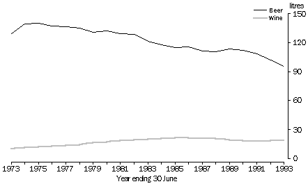 Apparent per capita wine consumption peaked in 1985-86 at 22 litres, then declined to 18 litres in 1992-93. Apparent consumption of alcohol in spirits has remained constant at just over 1 litre per capita over the past 20 years.