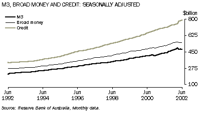 Over the period from 1992 to 2002 the amount of money in circulation in the Australian economy, as measured by the money supply measure "broad money", increased from $271.3b in June 1992 to $545.7b in June 2002. Money supply grew slowly from June 1992 until late-1993. Strong growth was then recorded from late 1993 to 2002.