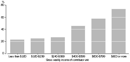 (b) $240-$599 gross per week. (c) $600 or more gross per week. (d) Includes income not known. Source: Health Insurance Survey Family composition Contributor units consisting of couples (with or without dependent children) had the highest levels of private health insurance coverage (over 50%), while those consisting of one contributor and dependent children had the lowest (23%). For all contributor unit types level of insurance coverage increases with income. The higher level of private health insurance coverage for contributor units containing couples reflects their generally higher incomes. Of such contributor units, 48% received high incomes, 42% received middle incomes and 4% received low incomes. Of contributor units consisting of a contributor (with or without dependent children), 15% received high incomes, 40% received middle incomes and 42% received low incomes. Couples with dependent children were more likely than other types of contributor units to have hospital and ancillary cover while couples without dependent children had the highest rate of hospital only cover. Ancillary only cover was more prevalent in contributor units with dependent children than in those without. PROPORTION OF CONTRIBUTOR UNITS WITH PRIVATE HEALTH INSURANCE, 1992