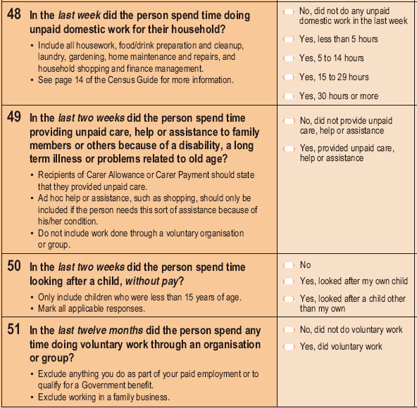 ABS has in the past resisted the inclusion of these items in the Census, arguing that better quality data is available from time use surveys.