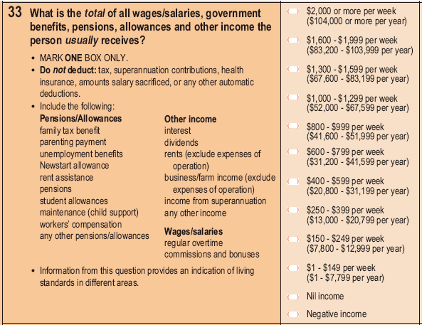 From the 1996 Census, categories for nil and negative income have been provided to overcome an apparent cause of non-response. To ensure that the ‘nil income’ category did not lead to biased results, the highest income categories were listed first. For the 2006 Census, the number of income response categories was reduced. Ranges were adjusted in line with rises in income since the 2001 Census and an additional range for higher incomes was added.