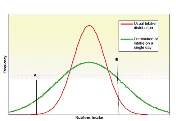 Figure 1 shows, in general terms, a population nutrient intake from a single day compared to a usual intake, and a general comparison to reference cut points which could represent NRVs. If cut-points A and B are set on the basis of long term or usual intakes, comparisons with unadjusted single day intakes are misleading. In the figure below, if cutpoint A was representative of a requirement for nutrient adequacy, the area below the red line and to the left of cutpoint A would represent the prevalence of inadequate intakes (see 1.3 Reporting against Nutrient Reference Values). If cutpoint B was representative of an upper safe level, the area to the right of cutpoint B and below the red line would represent the proportion at risk of adverse effects from excess intake. Although the means of the two distributions are similar, comparison of the unadjusted single day distribution (green line) to the cutpoints in place of the usual intake distribution (red line) misleadingly shows a greater proportion of the population below cutpoint A, and above cutpoint B. Adjusted intakes are also used to more accurately determine percentiles of usual population nutrient intakes.