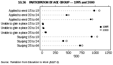 Between 1995 and 2000, the demand for education increased, as did the number of people being accepted into educational institutions. Although there was a rise in the number of enrolment applications across all age groups, there was a slight decrease in the number of people unable to get into courses (graph 10.36). While participation in education may occur at any age, many young people continue in full-time education immediately after completing compulsory schooling, either in post-compulsory schooling or within other forms of education such as VET. Some young people also return to full-time study after a period of absence some time after completing compulsory schooling. In all, 70% of 15-19 year olds at May 2000 were in full-time education (including 51% still at school). At age 20-24 years, 22% were undertaking full-time study (including less than 1% still at school) and 13% were participating in part-time tertiary study (table 10.37). Many people aged 25 years and over return to study, to upgrade their skills or to gain new skills, and often in conjunction with employment (see the article Combining work and study). The participation rate at May 2000 for people in this age group was higher for those in part-time study (6%) than for those in full-time study (2%).