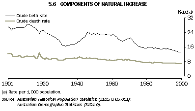 Since 1901, the crude death rate has fallen from about 12.2 deaths per 1,000 population to 6.7 in 2000. Crude birth and death rates from 1901 to 2000 are shown in graph 5.6.