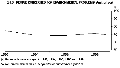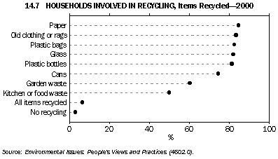 Australians who did not nominate the environment as their most important social issue were asked if they were concerned about environmental problems; in 1999 some 69% indicated that they were. The proportion of people expressing concern for the environment has declined slowly since 1992 (graph 14.3). People with higher incomes and more education are more likely to express concern for the environment (ABS 1996). However, higher household incomes can also increase environmental pressures because of the link between affluence and increased consumption of resources and waste production (Yencken and Wilkinson 2000). Donating time and money to environmental protection A study of the proportion of households donating time or money to environmental protection between 1992 and 1998 found an overall decline in the proportion in every State and Territory (graph 14.4). States and Territories that showed the largest falls were the Northern Territory (by 16%), the Australian Capital Territory (13%), Queensland (12%), and Western Australia (11%). New South Wales showed the smallest fall (5%) (Alle, Aravena and Henty 2001). The study also compared households located in the capital city of each State with those in the rest of the State (the comparison could not be done for households in the ACT and NT). It found that there were no large differences, in 1992 or 1998, in the proportions of households in the two categories donating time or money (graphs 14.5 and 14.6). Household waste management Household recycling Household solid waste is defined as waste from domestic premises; it includes household refuse, garden waste and other discarded materials, such as disused furniture. An important response to household waste is recycling. Household recycling has increased in Australia during the nineties: in 1992 around 85% of people recycled some items of waste; by 2000 this had risen to about 97%. Paper, old clothing, plastic bags and glass were the items most commonly recycled (graph 14.7). Only a small proportion of Australian households (just under 7% in March 2000) recycle all the waste items that can be recycled. While recycling rates have improved, more household waste still goes to landfill than is recycled; an audit in 1997 found that the average Australian household produced 15.7 kg of waste for collection each week (Beverage Industry Environment Council 1997). This comprised 11.9 kg of garbage, 3.1 kg of recyclables, 0.2 kg of contaminants and 0.5 kg of green waste. Recycling behaviour in Australia is different for different types of households. For example, one person households recycle less than all other types of households (graph 14.8). The most common reason provided by the 93% of Australian households that did not fully recycle in 2000 was a lack of recyclable materials in their waste (around 73% of the households not fully recycling). The next most common reason cited by households was the absence of recycling services or facilities; households from the Northern Territory were the most likely to select this reason for not fully recycling (graph 14.9). Only a small proportion of households (around 3%) in Australia recycled no waste items at all in 2000; this proportion has fallen in every State and Territory since 1992 (graph 14.10). National targets for minimisation of solid waste While recycling of solid waste by households is important, waste minimisation by all sectors has been seen by policy makers as the key to reducing the environmental pressures arising from solid waste going to landfill. In 1990 the Australian and New Zealand Environment and Conservation Council set a national target of a 50% reduction in waste going to landfill by the year 2000, based on 1990 per capita levels. This target has not been met, and it is possible that the levels of waste going to landfill have not been reduced at all (the uncertainty stems from a lack of consistent national data) (Chalkley Consulting and Global Environmental Consulting 2000). Estimates of household waste produced in Australia in the early nineties were around 400 kg per person per year (OECD 1999). Total solid waste going to landfill in Australia in 1996-97, however, was around 1,100 kg per person per year (total solid waste includes waste associated with councils servicing residential areas as well as commercial, industrial, construction and demolition waste) (ABS 1998). As the construction and demolition industries are thought to generate up to 40% of all solid waste going to landfill in Australia, businesses in these industries, in partnership with government, have initiated and funded their own improvements to solid waste management (Environment Australia 2000). Assessing the performance of the household sector in waste minimisation remains problematic. Household hazardous waste Households accumulate hazardous waste, such as garden chemicals and paint products. In 2000 a smaller proportion of households (21%) took their household hazardous waste to a dump or central collection point than in 1996 (30% of households). This decline was despite an increase in households' awareness of the availability of facilities in their area for the safe disposal of household hazardous waste (37% awareness in 2000 compared to 31% in 1996).