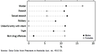 The most serious offences that had been committed by male prisoners, as at 30 June 2003, included offences against justice procedures, government security and government operations (12.5%) sexual assault (11.9%) and murder (11.6%). For female prisoners, the most serious offences included offences against justice procedures, government security and government operations (38.9%), murder (16.7%), theft (11.1%) and property damage and environmental pollution (11.1%).