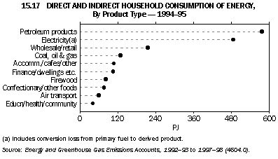 While the previous section showed the direct use of energy by industries and households, this section looks at the amount of energy used, both directly and indirectly, by the final users of the goods and services. These final users may not necessarily use energy directly, but they are considered to be using energy indirectly through the consumption of products (goods and services) the production of which entailed the direct use of energy. Households as direct and indirect consumers of energy The use of petroleum products - mainly motor vehicle fuels - was the biggest contributor to household consumption of energy (25% of total household consumption of energy), followed by household electricity use (21%), and various other sources of direct energy consumption by households (11%). Approximately two-thirds of household electricity use is attributed to conversion losses in the production of this electricity (mainly from coal). Indirect consumption of energy through the consumption of (non-energy) goods and services made up about 43% of total household energy use. The largest of these indirect sources was household consumption of wholesale and retail goods and services and of repairs (9%). Main products contributing to final household consumption of energy are shown in graph 15.17. Relative to its GDP Australia has a very high level of motorisation, and a high level of total personal travel. Other than the North Americans, only Italians are more motorised than Australians (OECD/IEA 2001). Per capita road transport use in Australia has increased 10% since 1990-91 (see table 15.21). Table 15.18 shows that the number of persons driving to work or study in Australia increased by 9% between 1996 and 2000. Some 76% of adults aged 18 years and above drove to work or study in 2000.