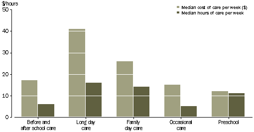Children attending long day care centres incurred the highest median cost ($41 per week) followed by family day care ($26), reflecting the longer median hours of attendance at these types of care (16 hours and 14 hours respectively). Before and after school care, occasional care and preschool were less expensive, with the median cost being $17, $15 and $12 per week respectively.
