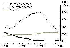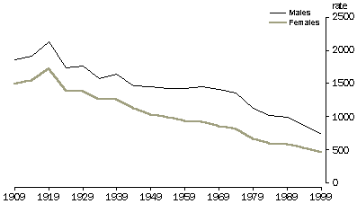 Source: AIHW Mortality Monitoring System. Causes of death The decline in deaths from infectious diseases, particularly in the younger age groups, was the driving force behind the decline in mortality in the first half of the 20th century. In 1920, infectious diseases accounted for approximately 15% of all deaths for both males and females; the death rate for males from infectious diseases was 189 per 100,000 males, and 147 per 100,000 females. Three of the leading causes of death at this time for males aged under 5 years were infectious diseases; diarrhoea and enteritis, diphtheria and measles. The decline in deaths from infectious diseases is generally believed to be the result of medical advances and an overall rise in living standards including improved nutrition levels, better sanitary, water and sewerage control, and better control of infection in hospitals.9 SELECTED DEATH RATES(a) FOR MALES (a) Rate per 100,000. Source: AIHW Mortality Monitoring System. Death rates from infectious diseases were at their lowest in the early to mid 1980s, when the death rate for males was less than 6 per 100,000 and the rate for females was less than 4. By 1999, deaths from infectious diseases had increased to 9 males per 100,000 and 6 for females, mainly due to an increase in septicaemia-related deaths. However, infectious diseases still accounted for only 1% of all deaths in the 1990s. As in other developed countries, as infectious diseases in Australia declined following World War I, degenerative diseases, in particular diseases of the circulatory system, began to rise as a proportion of the causes of all deaths. The emergence and dominance of diseases of the circulatory system was evident throughout most of the 20th century for both males and females, although the impact was greater for males. The age-standardised death rates for diseases of the circulatory system peaked for males in the late 1960s at 843 per 100,000, and for females in the early 1950s at 558 per 100,000. SELECTED DEATH RATES(a) FOR FEMALES (a) Rate per 100,000. Source: AIHW Mortality Monitoring System. Death rates for diseases of the circulatory system showed a significant improvement in the 1970s due in part to lifestyle changes such as a reduction in smoking (particularly among middle-aged men), and the consumption of less animal fats and increased fitness levels. In addition, there were a number of medical advances, such as improved methods of diagnosing coronary artery disease, increased use of medical services and more intensive and coronary care units.10 By 1998, the death rate for this group of diseases had declined to 285 males per 100,000 and 188 females per 100,000. By the 1970s, cancer was a leading cause of deaths in Australia. Cancer is not a single disease but rather a collection of diseases which share the common feature of uncontrolled growth of body cells.8 Paradoxically, a greater proportion of cancer deaths in a population often reflects the higher longevity of that population, as cancer is predominantly a disease of the elderly. As a proportion of all deaths, cancer deaths increased considerably during the 20th century. In 1909, cancer accounted for 7% of all male deaths and 8% of female deaths. By 1999, cancer had increased to become the cause of approximately 27% of all deaths among both males and females. CANCER DEATH RATES(a) (a) Rate per 100,000. (b) Lung cancer data only available from 1945. Source: AIHW Mortality Monitoring System. In 1909, the age-standardised death rate for cancer was similar for males and females (140 and 141 per 100,000). The rates for each sex began to diverge in the 1950s, and by 1985 the age-standardised male death rate from cancer was 248 compared with the female death rate of 146 per 100,000. The rise in deaths related to male cancers during this period can largely be explained by the increase in cancers of the trachea, bronchus and lung. Tobacco smoking has been linked with 85% of male lung cancers and 55% of female lung cancers.11 Although cancer death rates for males have recently declined, there is still a large disparity between the death rates for males and females from this disease. SELECTED CAUSES OF DEATH, 1999