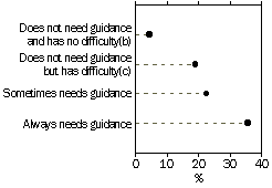 (b) The sum of the three guidance-related tasks exceeds the total because a person can need help with more than one task. (c) The sum of the restricting impairment types exceeds the total because a person can have more than one type of restricting impairment. (d) Includes those whose restricting impairment type(s) could not be determined because of insufficient information. Source: ABS 1998 Survey of Disability, Ageing and Carers. Types of restricting impairment Any loss or abnormality of psychological, physiological or anatomical structure or function can be classified to one of five broad types of restricting impairment (see Australian Social Trends 2001, Disability among adults). Need for guidance (i.e. need for help from others with at least one of the three guidance-related tasks) was most prevalent among those restricted by a psychological impairment (72%). Guidance was felt to be needed to a lesser extent among those restricted by an intellectual impairment (56%), by head injury, stroke or brain damage (41%), by a sensory or speech impairment (24%) and least of all among those restricted by a physical impairment (20%). Those restricted by a psychological impairment were also the most likely to need help to make friends, interact with others, or maintain relationships (37%), to cope with feelings or emotions (60%) and to make decisions or think through problems (54%). Frequency and intensity of need Of those who had a need for guidance because of their disability, 20% always needed such help and 80% only sometimes needed it. The majority (57%) needed help at least once a week, with almost one in four (24%) needing guidance on a daily basis. Of those who needed guidance, those restricted by a physical impairment tended to need guidance less often than those restricted by other types of impairment. Those restricted by head injury, stroke or brain damage (39%) and those restricted by an intellectual impairment (also 39%), were the most likely to need guidance on one or more occasions every day. PEOPLE AGED 15-64 YEARS WITH A DISABILITY(a) NEEDING GUIDANCE: INTENSITY AND FREQUENCY OF NEED FOR GUIDANCE - 1998
