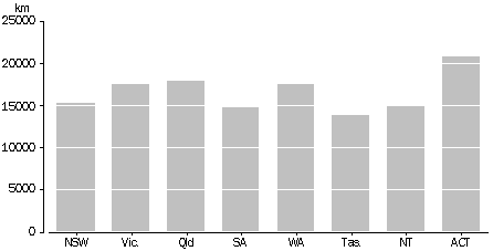(b) Refers to all children aged 0-14. Source: Environmental Issues: People's Views and Practices, Australia (cat. no. 4602.0). Distance travelled Of those households who had had their major vehicle for at least 12 months and who knew how far it had travelled, the median distance travelled in the 12 months to April 1996 was 16,600 kilometres. Households in the Australian Capital Territory travelled further (a median of 20,800 km) than those in the other States or the Northern Territory, while the median distance travelled was smallest in Tasmania (13,900 km). Statistics from the 1995 Survey of Motor Vehicle Use showed that passenger vehicles accounted for 74% (123,700 million kilometres) of total distance travelled in Australia, and freight-carrying vehicles 24% (39,600 million kilometres), in the 12 months ending September 1995.3 Since 1976, the total distance travelled by passenger vehicles and freight-carrying vehicles has increased by 58% and 95% respectively.