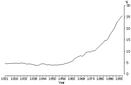 Source: Births, Australia (cat. no. 3301.0) Age of mothers The last thirty years have seen major changes in fertility patterns. Women are not only delaying child bearing until much later in their lives, they are also having fewer children and there is some evidence to suggest that they are concentrating their child bearing over a shorter span of years. Between 1964 and 1994, the fertility rate for teenage women fell from 0.24 to 0.10. These births represented 10% of all births in 1964 and 5% in 1994. Similarly, the fertility rate for women aged 35 and over fell from 0.38 in 1964 to 0.24 in 1994. These births represented 12% and 13% respectively of all births. These changes reflect women's greater control over their fertility, regardless of age or marital status, as well as a tendency to defer childbearing associated with increased education and employment opportunities. In 1964, peak fertility was among 24 year old women, with 23% having babies. By 1994, peak fertility was among 29 year old women, but only 13% had babies. While the proportions of women of each age who had a baby in the year were consistently less in 1994 than in 1964, the age concentration of births increased slightly. In 1964, 61% of births were to women in the ten year peak fertility age group (20-29) and 77% were in the fifteen year group (17-31). In 1994 the ten year peak fertility group (25-34) accounted for 63% of births and the fifteen year group (22-36) accounted for 83%. PROPORTION OF WOMEN GIVING BIRTH Source: Births, Australia (cat. no. 3301.0); Estimated Resident Population by Sex and Age, States and Territories of Australia (cat. no. 3201.0) Endnotes 1 Quoted in Hicks, N. (1978) 'This sin and scandal' ANU Press, Canberra. 2 Browne, E. (1979) The Empty Cradle NSW University Press, Sydney. 3 Birrell, R. and T. (1987) An Issue of People 2nd ed., Longman Cheshire Pty Ltd, Melbourne. 4 Siedlecky, S. and Wyndham, D. (1990) Populate and Perish Allen & Unwin Australia Pty Ltd, Sydney.