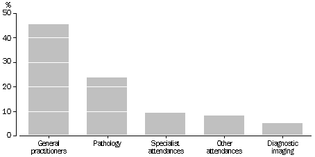 Source: Health Insurance Commission Annual Reports; Australian Demographic Statistics (cat. no. 3101.0). Service use and age The average use of services under Medicare varies with age and sex. Up to the age of 14 boys and girls have similar patterns of use. In 1993-94, infants (0-4 years) used about 10 services per year while older children (10-14 years) had the lowest use for all ages at 5 services per year. From 15 years of age onwards the average number of services per year gradually increased for men while that for women increased rapidly and remained higher than that for men at all ages. Between the ages of 25 and 34, the age range in which many women have children, the average use by women was 13 services per year while that for men was 6. The greatest use of Medicare services was made by people aged 75 or over. They averaged 20 services for men and 23 for women during 1993-94. AVERAGE NUMBER OF MEDICARE SERVICES USED PER PERSON, 1993-94 Source: Health Insurance Commission Annual Report 1993-94 State differences There are distinct differences in the average use of Medicare services per person between the states and territories. These differences remain even when the rates are standardised to remove the effect of different age structures. In 1993-94, New South Wales had the highest average standardised rates with 9 services per year for males and 13 for females. The Northern Territory had the lowest standardised rates with 5 services per year for males and 9 for females. These differences may reflect different state usage rates of hospital out-patient services, the mix of public and private hospital usage in the states, regional variation in clinical practises and varying access and availability of medical services between states. Studies have shown that as the number of general practitioners per person increases the number of services used per person increases3. AGE STANDARDISED(a) AVERAGE NUMBER OF MEDICARE SERVICES USED PER PERSON, 1993-94 (a) The average Medicare usage rate if the states/territories had the same population age and sex structure as Australia. Real age-specific usage rates are used for each state/territory. Source: Health Insurance Commission Annual Report 1993-94 Types of service used The three most common types of service used in 1993-94 under the Medicare system were general practitioners (45%), pathology (24%) and specialists attendances (9%). Between 1984-85 and 1993-94 the use per person per year of most types of service increased. Radiology and pathology services increased by the greatest proportions. Radiology services increased from 0.3 services per person to 0.5 (a 78% increase) and pathology services increased from 1.4 to 2.4 services per person (a 71% increase). Specialist services increased from 0.7 to 0.9 services per person (a 42% increase) and general practitioner services increased from 4.1 to 5.4 (a 33% increase). THE FIVE MOST COMMON SERVICES USED UNDER MEDICARE, 1993-94 Source: Health Insurance Commission Annual Report 1993-94 AVERAGE USE OF SELECTED MEDICARE SERVICES(a) PER PERSON