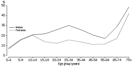 People not using services Although the average number of Medicare services per person is a simple and convenient measure of service use, it understates the actual use per person because people who did not use a Medicare service are included. The proportion of people who did not make a claim for a Medicare service varied with age and sex. Among males aged 25-34, 30% did not make a Medicare claim during 1993-94. Among females under 55 years the highest rate of not using any Medicare services occurred among girls aged 10-14, 20% of whom made no claims in 1993-94. The data for men and women aged 55 and over indicate that high proportions used no Medicare services. This must be interpreted carefully. As previously discussed, older people who use health services under the Medicare scheme have the highest average use of Medicare per person. However, older people are also the most likely to be using public hospital in-patient care without charge and therefore not using the Medicare system. The medical services of the Department of Veterans Affairs programs also provide medical service outside of the Medicare system. PEOPLE WHO DID NOT USE A MEDICARE SERVICE, 1993-94