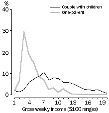 One-parent income units For a significant minority, a major life cycle transition is from couple with dependent children to lone parent (usually mother) with dependent children. The employment options for the one potential earner can be severely limited by the demands of caring for children alone so that, on average, income levels of one-parent income units are less than half that of couples with dependent children. In 1995-96 the average weekly income of one-parent income units was $433. Most (72%) received less than $500 per week while only 5% received $1,000 or more. Over half (59%) of one-parent income units were dependent on government pensions and allowances (mainly the sole parent pension and family allowance) for all or most of their income. While almost half (47%) of lone parents had paid work, only 38% derived most of their income from earnings.