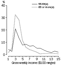 Older income units (65 years and over) For older couples (reference person aged 65 years and over) labour force participation is much lower than those with a reference person aged 55-64. In 1995-96 only 14% of these units had one or more earners and 7% derived most of their income from earnings. The proportion deriving most of their income from superannuation, property and investments was higher (22%) as was the proportion (70%) dependent on government pensions - primarily the age pension. Consequently, income levels were much lower, averaging $429 per week. Only 5% received $1000 or more per week while 79% received less than $500. Reflecting the difference in life expectancies between men and women throughout this century, the majority (74%) of older one-person income units (aged 65 years and over) are women. Labour force participation declines rapidly after 65 years of age and older women are less likely than their male cohorts to be employed, or to have ever had long-term paid employment. These factors contribute to older one-person income units having the highest rates of dependence on government pensions (80% in 1995-96), the lowest levels of employment (4%) and the lowest average incomes ($226 per week). GROSS WEEKLY INCOME OF SELECTED LIFE CYCLE GROUPS, 1995-96