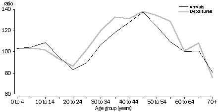 (a) Rate per 1,000 mid-year population. Source: Overseas Arrivals and Departures Age and sex structure Immigrants and emigrants both tend to fall within a fairly narrow age range. 54% of both immigrants and emigrants were aged 15-34 in 1993, compared to 32% in the entire Australian population. In 1993 the median age of all Australians was 33. The median age of immigrants was 28 and the median age of emigrants was 29. While the numbers of both immigrants and emigrants aged 15-24 were significantly smaller than the numbers aged 25-34, the net migration was larger in the 15-24 years age group (17,000 compared to 14,000). Overall there were slightly more male immigrants than female (101 males per 100 females), and significantly more male emigrants than female (108 males per 100 females). This resulted in 87 males per 100 females in net overseas migration. In each age group, the ratio of males per 100 females (sex ratio) was similar for immigrants and emigrants. Up to age 15, there were more males arriving and departing than females, reflecting the proportions of boys and girls in the population. Women outnumbered men in the 15-24 years age groups in both arrivals (87 men per 100 women) and departures (88 men per 100 women). Between ages 30 and 69 men outnumbered women in both arrivals and departures, with the largest difference among 45-49 year olds, where, for both immigrants and emigrants, there were 138 men per 100 women. After this age, men's shorter life expectancy results in the gradual fall in the ratio of men to women with increasing age. Among immigrants aged 70 and over, there were 80 men per 100 women, and among emigrants, there were 76 men per 100 women. AGE STRUCTURE OF PERMANENT AND LONG-TERM OVERSEAS MIGRANTS, 1993