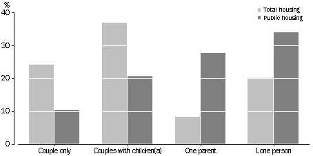 Lone-person and one-parent households have the lowest average incomes of all household types, and it is not surprising that they are over-represented in public housing. Many of the lone-person households in public housing were aged people.