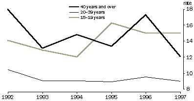 Although the proportion of first births to all births remained relatively steady between 1993 and 1999, there was a change in the age distribution of mothers having their first birth. Women experiencing their first birth in 1999 tended to be older than women having a first birth in 1993. Approximately 28% of all first births in 1993 were to women aged 30 years and over. By 1999 this had increased to 34%. In contrast, 31% of all first births in 1999 were to women aged 15-24 years (down from 37% in 1993).