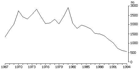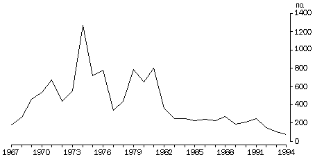 Number of disputes In the period 1969-83, the number of industrial disputes recorded annually fluctuated considerably but was consistently higher than the number of disputes in the period 1983-94. Since 1984, there has been a steady downward trend in the number of industrial disputes. While this is part of a world-wide trend, the decline in Australia has been much greater than in other parts of the world1. In 1994, there were 560 industrial disputes the lowest number since 1940. INDUSTRIAL DISPUTES Source: Industrial Disputes (cat. nos 6322.0 and 6322.0.40.001).Working days lost Displaying a similar pattern to the numbers of industrial disputes, the numbers of working days lost per 1,000 employees were consistently higher and fluctuated more in the period 1967-83 than in the period 1983-94. Disputation intensified in the first few months of 1974 but there was no significant increase in the number of disputes2. A combination of increased employee involvement in disputes and increased duration of disputes produced the high figure of 1,273 working days lost per 1,000 employees. This can be attributed to the high figures in Victoria (1,757) and New South Wales (1,462). In 1975, the Australian Conciliation and Arbitration Commission, with the support of the government, introduced a system of wage indexation which '...appeared to arrest the wage-price spiral for at least a time.'3 By 1977 the number of working days lost per 1,000 employees had fallen to a low of 336. This subsequently rose to 787 in 1979 and remained about this level until 1982 when it dropped to 358. The period 1974-83 was one of rapid and sustained increases in unemployment. The unemployment rate rose from 2% in 1973-74 to 9% in 1982-83. In 1983, the number of working days lost per 1,000 employees was 249. By 1994, this had declined to 76, the lowest number since the series was first compiled in 1967. The economic recovery in the second half of 1983 was the beginning of a long period of strong employment growth. Unemployment fell from 9% in 1982-83 to 6% in 1989-90. It then started to rise again and in 1992-93 reached a high of 11%. (see Work - National summary tables). WORKING DAYS LOST PER 1,000 EMPLOYEES Source: Industrial Disputes (cat. nos 6322.0 and 6322.0.40.001).Causes of disputes Data on causes of industrial disputes only refer to the main cause of a dispute. Therefore the relative importance of all causes as perceived by both employers and employees may not be reflected. Between 1967 and 1994 managerial policy and wages together were the causes of most industrial disputes ending in a year and accounted for at least half of the working days lost. In 1967, managerial policy was the major cause of industrial disputes (572), followed by wages (316) and physical working conditions (200). In 1994, these causes were also the top three with managerial policy accounting for 317 disputes, wages accounting for 66 and physical working conditions for 61. In both 1967 and 1994 disputes over managerial policy caused more working days lost than disputes over any other single cause. In 1967, 252,300 working days were lost due to disputes over managerial policy compared to 158,900 in 1994. Between 1967 and 1982 disputes over wages accounted for more working days lost than disputes over any other cause. In 1974, the proportion of working days lost due to disputes over wages peaked at 88%. Since 1983 disputes over managerial policy have generally accounted for more working days lost than disputes over any other cause. In 1990, the proportion of working days lost due to disputes over managerial policy peaked at 75%. PROPORTION OF WORKING DAYS LOST DUE TO INDUSTRIAL DISPUTES OVER WAGES AND MANAGERIAL POLICY Source: Industrial Disputes (cat. nos 6322.0 and 6322.0.40.001).