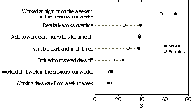 There were differences in certain employment arrangements between male and female employees in 2000. Male employees were more likely than female employees to work overtime on a regular basis (39% compared with 25%), to work at night or on the weekend (69% compared with 57%), to have variable start and finish times (38% compared with 29%), and to be entitled to rostered days off work (24% compared with 16%). Female employees were more likely to have a pattern of working days that varied from week to week (16% compared with 12% of male employees).