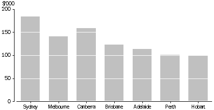 The national picture given by the affordability index, however, masks differences in the index across capital cities. For the financial year ending June 1993, the index showed accessibility of housing greatest in Hobart and Perth and least in Sydney. Comparing it to the moving annual median prices of established houses in June 1993, housing affordability varied between capital cities according to house prices, since interest rates remained comparable between States and Territories. Sydney had the highest house prices and the lowest affordability index. In contrast Hobart house prices were the lowest of all capital cities and, accordingly, the housing affordability index was the highest.