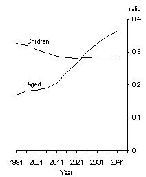 Dependency ratios By the year 2026 the number of aged persons will exceed the number of children. The aged dependency ratio is projected (under series A assumptions) to increase fairly slowly, from 0.18 in 1993 to 0.21 in 2011, then more rapidly to 0.36 in 2041. During this period the child dependency ratio is expected to decline until 2011 and then to stabilise at around 0.29. The decrease in the child dependency ratio implies a decrease in outlays on children's services. However, this will do little to offset the likely increase in outlays associated with ageing, particularly on health services and income support, which are much higher than the outlays associated with children1. In 1993 South Australia had the highest aged dependency ratio (0.20) followed by Tasmania (0.19), New South Wales and Victoria (both 0.18). In 2041 aged dependency ratios are expected to be highest in Tasmania (0.43), South Australia (0.42), and Victoria (0.40) (see Population - State summary tables). PROJECTED DEPENDENCY RATIOS (SERIES A) Source: Population Projections, 1993-2041: Series A; Estimated Resident Population The aged population The aged population is expected (under series A assumptions) to grow from 2.1 million in 1993 to 5.5 million in 2041, increasing as a proportion of the total population from 12% in 1993 to 22% in 2041. The largest increases (of about 98,000 a year) are projected to occur during 2011-31 as survivors of the 'baby boom' generation (born in the late 1940s to 1960s) reach retirement age. The number of persons aged 85 years and over is projected to increase by an average of 10,000 a year until 2026 (except during 2016-21 when the very low birth rates of the 1930s depression are echoed in this cohort), and then by an average of 26,000 a year during 2026-41. Women have a longer life expectancy than men (see Health - National summary tables) and therefore outnumber men in the older age groups. In 1993 there were 76 men for every 100 women aged 65 years and over. By 2041 the aged sex ratio is expected to be 79, reflecting a prospective reduction in the gap between male and female life expectancy. For persons aged 85 years and over the sex ratio is projected to increase from 42 in 1993 to 50 in 2041. In 2041 women are expected to be 56% of the aged population and 67% of persons aged 85 years and over. South Australia has the oldest age structure of all States and Territories, a situation expected to remain unchanged well into the next century. By 2041, the aged are projected to represent 25% of the State's population, and children 15%. The aged are also projected to represent 25% of Tasmanians, and children 16%. In both States persons age 85 years and over are projected to account for over 4% of the population compared to the national average of 3.5%. Victoria's population is also expected to have a relatively old age profile in 2041 while New South Wales will remain close to the national average. PROJECTED AGED AS A PROPORTION OF THE POPULATION (SERIES A) Source: Population Projections, 1993-2041: Series A; Estimated Resident Population AGE DISTRIBUTION OF THE PROJECTED POPULATION (SERIES A), 2041