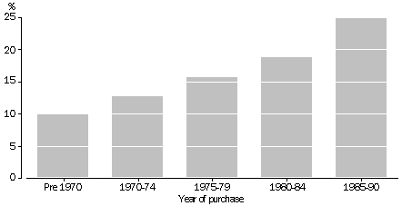 Home purchasers At low income levels, home purchasing couples with dependants spent a higher proportion of their income on home purchase than other income unit types. Between 1982 and 1990 the proportion of their income spent on home purchase increased from 35% to 50%, a consequence of the higher interest rates in the late 1980s. The reduction in interest rates after their peak in 1990 is likely to have eased this situation in subsequent years. Couples without dependants spent a lower proportion of their income on home purchase than other income unit types. At high income levels, average spending on home purchase was much the same at about a quarter of income regardless of income unit type. Another factor influencing affordability for home purchasers is the length of time for which they have been paying their home loan. Older loans are generally easier to service in that the repayments the lender requires usually remain static over the term of the loan while a person's income usually increases with age. Hence, the proportion of income spent on housing generally decreases for older people who have older mortgages. However, flexible home loan arrangements promoted by financial institutions in recent years have affected, and will continue to affect, this pattern. PROPORTION OF INCOME SPENT ON HOUSING BY HOME PURCHASERS