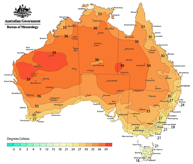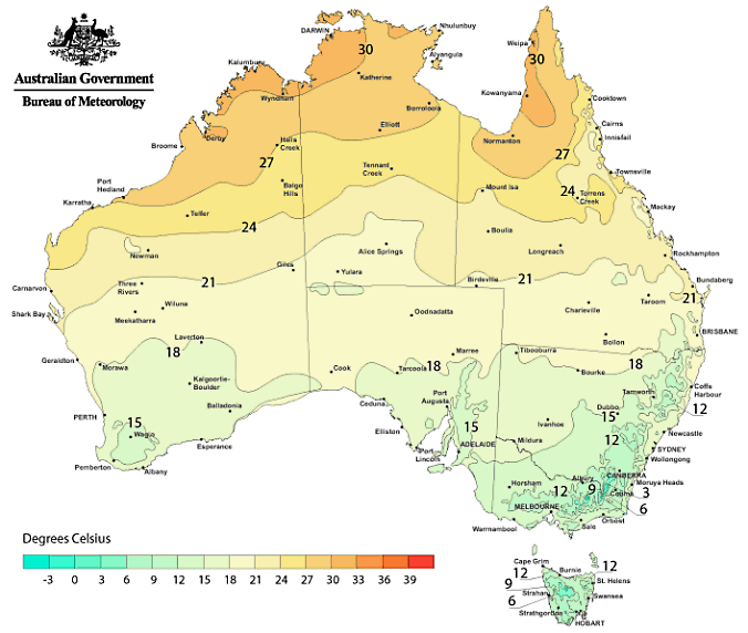 The island continent of Australia features a wide range of climatic zones, from the tropical regions of the north, through the arid expanses of the interior, to the temperate regions of the south. Australia is the world’s second-driest continent (after Antarctica), with mean annual rainfall below 600 millimetres (mm) per year over 80% of the continent, and below 300 mm over 50%. Summers are hot through most of the country, with average January maximum temperatures exceeding 30 degrees Celsius (°C) over most of the mainland except for the southern coastal fringe between Perth and Brisbane, and areas at high elevations. Winters are warm in the north and cooler in the south, with overnight frosts common in inland areas south of the Tropic of Capricorn; only at higher elevations do wintertime temperatures approach those found in much of northern Europe or North America.