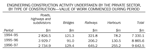 Engineering Construction Survey Engineering Construction Survey Contact Contact Officer Building and Construction Section Australian Bureau of Statistics GPO Box 2272 ADELAIDE SA 5001 Telephone: Adelaide 08 8237 7672 Facsimile: Adelaide 08 8237 7620 Email: client.services@abs.gov.au Internet: www.abs.gov.au Purpose To measure the value of all engineering construction work undertaken in Australia. Description The results from this survey together with the results from the Building Activity Survey, provide a complete quarterly picture of building and construction activity in Australia. This survey is a quarterly sample survey of approximately 2,400 respondents. The survey framework includes all enterprises recorded on the ABS Register of Businesses and classified to the construction industry and all other units known to be undertaking engineering construction work. Data are collected by mail questionnaire. Data Detail In relation to transport, data are available on engineering construction work on roads, highways, bridges, railways and harbours. Geographic Coverage Australia, States and Territories. Frequency of Data Availability Data are released quarterly. Historical Data The survey was first conducted in 1986. Products and Services Publications Engineering Construction Activity, Australia (cat. no. 8762.0) Other PC AUSSTATS 02 6252 6017 Example of Information Available