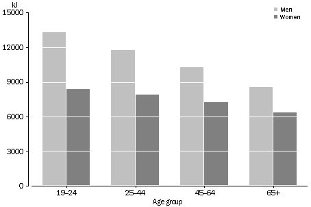 Energy intake Energy is not a nutrient but is released from food components containing fats, proteins, carbohydrates (includes starch, and related substances) and alcohol. The body uses energy from food for a variety of purposes including metabolic processes, physiological functions, muscular activity, heat production, growth, and synthesis of new tissue. Recommended energy intakes are difficult to calculate even among individuals of the same age, sex, weight, height and general pattern of activity. Therefore the energy requirement for healthy people is often expressed as the amount of energy needed to maintain the status quo. In 1995 males had a greater average energy intake than females at all ages. Between the 19-24 and 65 and over age groups, the average energy intake of men decreased from 13,280 kJ to 8,510 kJ and for women from 8,370 kJ to 6,370 kJ. The total energy intake of men aged 19-24 was 59% greater than that for women and then declined to 34% greater for those aged 65 and over. Carbohydrates contributed the largest proportion of energy intake for all age groups. It contributed about 48% of the daily energy intake for adults aged 19-24, reducing to 45% for adults aged 45-64. The contribution of protein to overall energy intake steadily increased from 16% for adults aged 19-24 to 18% for adults aged over 44. Fat contributed between 32% and 33% of energy in all age groups over 18. Food and beverages purchased and consumed away from home form a large and increasing contribution to the diet of Australians. In 1993/94 eating out and take-away food and beverages (excluding alcoholic beverages) accounted for 23% of the average weekly food and beverages budget. This is an increase of 5% since 1984. Alcoholic beverages accounted for an additional 14% of this budget, a decline of 1%.3 In 1995 food and beverages purchased and consumed away from home had a higher fat content than those consumed at home. Women were less likely than men to purchase and consume food and beverages away from home (57% compared to 64%). However, when they did, this food on average had a higher fat content than food purchased by men (36% compared to 34%). This difference may be partly explained by men's more frequent and higher consumption of alcoholic beverages which contribute to energy intake but not fat to the diet. Consequently, food purchased and consumed away from home contributed a smaller proportion of total energy for women (22%) than men (26%).