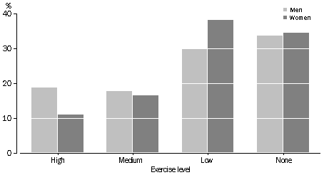 Exercise Regular physical exercise is also an essential factor when determining whether or not a person has an excess energy intake. Contrary to the Australian image as active outdoor sports-oriented people, many Australians have a sedentary lifestyle. Men and women were equally likely to have exercised (66% for men and 65% for women) but men were more likely to have exercised at a higher level (exercise that caused perspiration or a large increase in heart rate, 18% compared to 11%). 30% of men and 38% of women had exercised at a low level (leisurely walk). The proportion of people who had exercised also decreased with age. Of those aged 19-24, 74% had exercised, but this gradually declined to 57% of those aged over 64. People who were within a normal weight range were slightly more likely to have exercised than those who were overweight or obese (70% compared to 65%) and to have exercised at a higher level. Of those within a normal weight range, 34% had exercised at a low level, 19% at a medium level and 16% at a high level. In comparison, 34% of those who were overweight or obese had exercised at a low level, 16% at a medium level and 14% at a high level.