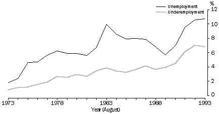 Source: Labour Force Survey Demographic characteristics The majority of part-time workers (75% in 1993) are women and the increasing participation of women in the labour force has been one of the major factors on the supply side of the labour market associated with the increase in part-time employment. The female labour force participation rate increased 10 percentage points between 1973 and 1993, rising from 41% to 51%. Over 90% of the increase was due to an increase in participation in the part-time labour market. Increasingly women are combining work with family responsibilities and part-time work provides an important means of achieving this. In 1993 the incidence of part-time work was highest among married women at 47% compared to 35% for unmarried women. The incidence of part-time work among men in 1993 was 10%. Students are another important source of part-time labour and the increase in participation in education among 15-24 year olds, particularly through the 1980s, has been another important trend contributing to an increase in the supply of potential part-time workers (see Education - National summary tables). Participation in full-time education among 15-24 year olds increased from 25% to 38% between 1982 and 1992. Over the same period participation in the full-time labour force by 15-24 year olds declined, from 61% to 48%, while participation in the part-time labour force increased, from 11% to 21%. About 40% of the overall increase in participation in the part-time labour force between 1973 and 1993 was due to increased participation by 15-24 year olds, a large proportion of whom are students. One other group which requires special mention with respect to part-time work is older male workers, particularly those in retirement. Although men in the 55-64 year age range represented only a little over 3% of the total part-time labour force in 1993, 12% of those who were working, worked part-time, compared to 6% of men aged 25-54 years. This partly reflects the use of part-time work as a means of easing into retirement (see Early retirement among men). EDUCATION AND LABOUR FORCE PARTICIPATION OF 15-24 YEAR OLDS Source: Labour Force Survey; Survey of Transition from Education to Work. Part-time work and unemployment The fact that such a large proportion of the pool of people working or wishing to work part-time are married women and students impacts on the relationship between employment growth and unemployment. A number of researchers have argued that among these particular groups a large proportion are likely to have been outside the labour force prior to obtaining a job. Similarly, if married women or students lose their part-time jobs they are likely to leave the labour force, rather than enter the pool of unemployed for any extended period. In essence this means that many of the participants in the part-time labour market effectively bypass the unemployment pool upon entering or exiting the labour force. This has critical implications for the way in which job growth affects measured unemployment. As the mix of new jobs changes, with more jobs being part-time, the effect of overall job growth on measured unemployment is diminished. This partly explains why at the present time Australia has a high unemployment rate despite many years of high overall employment growth. Some support for this argument can be found in the fact that increases in part-time work have corresponded with increases in participation in the labour force by women, particularly married women, and students. Some support can also be found in the fact that in 1992, 67% of people outside the labour force who wanted to work said they would prefer a part-time job. Moreover, 64% of discouraged jobseekers i.e. people who had left the labour force because they could not find a job, also said they would prefer part-time work. At the same time only 14% of the people who were unemployed said they were looking for part-time rather than full-time work. Underemployment The majority of people working part-time do so by choice. Nevertheless, with the growth in unemployment in recent years the number of people working part-time who would prefer more hours has been increasing, as has the number of full-time workers forced to work part-time hours because of lack of work. Combined, these two groups of workers comprise the underemployed. In 1993, 580,000 people were underemployed, a slight decline from the previous year. The underemployment rate (underemployed expressed as a percentage of the labour force) was 7%. About 12% of the underemployed were full-time workers stood down or on short time because of insufficient work. The remainder, just over half a million, were part-time workers. Of these, 186,000 (36%) had actively looked for full-time work in the four weeks prior to the survey. The half million underemployed part-time workers represented 28% of all part-time workers in 1993. 62% of underemployed part-time workers were women compared to 75% of all part-time workers. The highest incidence of underemployment among male part-time workers was in the 25-34 years age group of whom 60% wanted to work more hours. The highest incidence of underemployment among women was 43% in the 20-24 years age group. Overall, 44% of male part-time workers were underemployed compared to 23% of female part-time workers. UNDEREMPLOYMENT AND UNEMPLOYMENT RATES Source: Labour Force Survey; Survey of Transition from Education to Work. TOTAL AND UNDEREMPLOYED PART-TIME WORKERS, AUGUST 1993