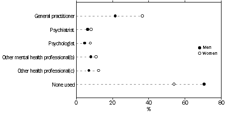 (b) During the four weeks prior to interview, according to the Brief Disability Questionnaire. Source: Mental Health and Wellbeing Profile of Adults, Australia, 1997 (cat. no. 4326.0). Health service use Some people experience a mental disorder once and fully recover. For others, it recurs throughout their lives or in episodes. The vast majority of mental illnesses are able to be treated if they have access to appropriate care and services2. Of those with mental disorders in 1997, 38% used a health service for their mental health problems in the previous 12 months. Women were more likely than men to use health services (46% of women compared to 29% of men). The most commonly used health service for both men and women was consulting a general practitioner (22% and 37% respectively). The likelihood of using health services for a mental health problem was closely related to the type of mental disorder. Of those with affective disorders only, 56% used health services, compared to 28% of those with anxiety only and 14% of those with substance use disorders only. Those with combinations of mental disorders were the most likely to use services for mental health problems (66%). For those with a disability, service use for mental disorders increased with the severity of the disability. A small proportion of people with no mental disorders also used services for mental health problems (5%). These people may have consulted a health professional for a sub-clinical mental disorder such as stress, or for a mental disorder not included in the analysis of the National Survey of Mental Health and Wellbeing.