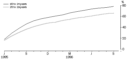 Educational attainment There were many factors associated with the labour market outcomes of young jobseekers. One of these was their educational attainment. Jobseekers with low levels of educational attainment were less successful in finding stable work. Those who had not attended the highest level of secondary school were the least likely to have found a stable job by September 1996 (24%), compared to 39% of those who had attended the highest level of secondary school. Prospects were more favourable for those with post-school qualifications. By September 1996, 46% of these were in stable work. Labour market history Young jobseekers who had some work experience before September 1994 (the start of the reference period of the survey) appeared to have better chances of finding stable work. Of those who had worked before September 1994, 38% found stable work, compared to 23% of those who had not previously worked. Because they were older, and may have had a longer period to participate in the labour market, jobseekers aged 20-24 were more likely to have had previous work experience than jobseekers aged 15-19. Of those aged 15-19, 58% had worked before September 1994, compared to 84% of those aged 20-24. Another factor associated with young jobseekers' labour market outcomes was their history of looking for work. Young jobseekers who had only looked for work for a short period of time were more likely to find stable work. Of those who had looked for work for one year or less in total between finishing full-time education and September 1994, 39% had found stable work by September 1996. Only 24% of those who had looked for work for between two and three years in total and 18% of those who had looked for work for four or more years in total had found stable work. Parental background Labour market outcomes of jobseekers were also correlated with the labour force status of their parent/s, particularly of their father. Over half (164,000) of young jobseekers were living at home with one or both parents in September 1995. For 125,200 of these, their father was living at home. Of those whose father was employed, 43% had found stable work by September 1996. In contrast, of those whose father was unemployed or not in the labour force, only 20% were in stable work. For 154,900 young jobseekers, their mother was living at home. Of those whose mother was employed, 41% had found stable work compared to 31% of those whose mother was unemployed or not in the labour force. Where people lived also influenced this relationship. In areas experiencing generally higher unemployment rates, both parents and children were likely to be similarly affected. Jobseekers who had worked Although they were less likely than older jobseekers to have had previous work experience, young jobseekers found work more quickly than those aged 25 years or more. After May 1995, the proportion working was similar in both age groups. However, 46% of those aged 15-24 had held a job at some time between May 1995 and September 1995, compared to 36% of older jobseekers. By September 1996, these proportions had risen to 78% and 66% respectively. By September 1996 more young jobseekers had found stable work (33%, compared to 29% for older jobseekers). CUMULATIVE PERCENTAGE OF JOBSEEKERS WHO HAD WORKED AT SOME TIME SINCE MAY 1995 Training courses In total, 64,000 young jobseekers participated in an in-house training course and 73,600 participated in an external training course between May 1995 and September 1996. Opportunities for training at work were enhanced for those who found stable work. Of these, 36% had participated in in-house training. Overall, 24% of young jobseekers participated in an external training course, with those who found unstable work having the highest rate of participation (28%). The skills from training courses helped some young jobseekers to find work or a better job. Of those who participated in an in-house training course, 18% attended at least one that had helped them obtain a better job, a promotion or a payrise. Of those who had participated in an external training course while they were not working, 13% attended at least one that resulted in a job (see Australian Social Trends 1998, Workplace training). PARTICIPATION IN TRAINING COURSES, MAY 1995 TO SEPTEMBER 1996