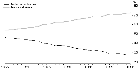 Over the past few decades the Australian labour force has changed substantially. The shift in labour demand arising from new technology, microeconomic reforms (such as tariff reductions, industrial relations reforms and changes to standards and regulations) and internationalisation of product markets have all contributed to this change. Another factor affecting the demand for labour has been the adoption of new management strategies that emphasise work force flexibility, particularly increased use of part-time and casual employees. Employment has grown significantly in the service sector, particularly in the property and business division and the accommodation, cafes and restaurants division. On a smaller scale, changes in home life have led to an increased demand for services to replace in part those traditionally carried out within the home, such as child care and meal preparation. Along with this growth in the service sector there has been a decline in employment in production industries like manufacturing and mining1. In addition to changes in the relative shares of people employed in different industries, changes in processes and products within industries have led to a shift in the sorts of jobs that employers now offer. These jobs generally require employees with a greater level of skill. Technology has been one of the main agents of change. Computerisation, mechanisation and automation have been incorporated into the work place with the common result of reducing the need for labour and creating new types of jobs1. Another major influence on industrial restructuring has been government economic policy. Generally, the Australian economy has always been vulnerable to the world economy, particularly to commodity prices and overseas competition. For most years since the early 1970s Australia has spent more on importing goods and services than it has earned from exporting them (known as a goods and services deficit). This led to government economic initiatives in the 1980s aimed at creating a more efficient and less sheltered manufacturing sector that could earn export dollars. These initiatives included gradual cutting of tariffs, floating the Australian dollar, liberalisation of foreign investment and allowing foreign banks into Australia2. PROPORTION OF ALL EMPLOYED PEOPLE IN THE PRODUCTION AND SERVICE INDUSTRIES Source: Labour Force, Australia, Historical Summary 1966 to 1984 (cat. no. 6204.0) and Labour Force, Australia (cat. no. 6203.0).