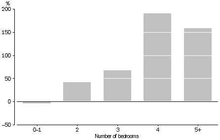 Larger dwellings The Australian Census does not collect comprehensive information on the size of dwellings, but it does record the number of bedrooms in a dwelling. This provides a broad indicator of dwelling size but does not take into account the size of the bedrooms. This indicator also misses other rooms that have become common in newer dwellings, such as rumpus rooms, ensuite bathrooms, studies etc. Australian Census data show that between 1971 and 1996 the average number of bedrooms per occupied private dwelling had increased from 2.7 to 3.0. This increase is due to the growth in the number of dwellings with more than three bedrooms and a decline in the number with zero or one bedroom. The number of dwellings with zero or one bedroom declined by 5% over the period (representing a proportional change from 10% of occupied private dwellings in 1971 to 5% in 1996). The number of dwellings with 4 and 5 bedrooms grew by 190% and 158% respectively (representing a proportional change from 11% and 2% respectively of occupied private dwellings in 1971 to 19% and 3% respectively in 1996). The proportion of dwellings with 3 bedrooms, the most common arrangement, has remained relatively steady at around 50%. The trend to larger houses is also demonstrated by data collated from new housing approval applications. In 1983 the average size of private sector dwellings was 167 square metres. By 1997 this had risen to 212 square metres (see Australian Social Trends 1998, Housing - National summary tables). This pattern of growth is also reflected in the average size of public housing building approvals which increased from 104 square metres in 1983 to 154 square metres in 1997.