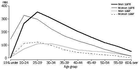 The highest remarriage rates for divorced people were 111 per 1,000 among men aged 30-34 and 122 per 1,000 among women aged 25-29. These rates represent a considerable decline in remarriage rates from those prevalent in 1976 when the highest rate for men was 353 per 1,000 among those aged 25-29 and the highest rate for women was 326 per 1,000 among women aged 20-24. However, since a large number of divorces were granted soon after the introduction of the Family Law Act in January 1976, remarriage rates for 1976 were particularly high. A large proportion of the decline in remarriage rates, indicating fewer people choosing to marry, can be attributed to the growth in de facto partnering. More couples are choosing a de facto relationship in preference to registered marriage or as a prelude to marriage (in 1997, about 78% of marriages involving partners who were both previously divorced were preceded by a period of cohabitation1). The same explanation probably underlies the similar decline in marriage rates for first marriages.