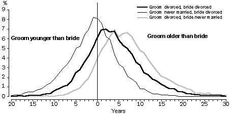 Among first marriages in 1997, the bridegroom was on average older than the bride by about two years, although the move towards an increasing proportion of bridegrooms marrying older brides continued (see Australian Social Trends 1997, Age at first marriage). Among remarriages, the difference between bridegrooms and brides was on average about four years. However, the age differences seem to be related to whether both or only one partner is divorced.
