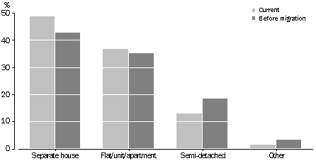 (b) Includes renting from employer. (c) Includes rent free from employer. (d) Includes other occupancy arrangements. Source: Department of Immigration and Multicultural Affairs, unpublished data, Longitudinal Survey of Immigrants to Australia. Government financial assistance At the time of interview 30% of all recent migrating units (including over three quarters of those in the humanitarian group) were receiving financial assistance from the government for housing purposes. This included help with mortgage payments and with rental payments in both public and private rented accommodation.1 Type of dwelling About half (49%) of all recent migrating units were living in separate houses at the time of interview - 37% were living in flats, units or apartments, and 13% were living in semi-detached housing (e.g. duplex, town house, row/terrace house). Recent immigrants were less likely to be living in semi-detached housing in Australia than before migration, and more likely to be living in separate houses, flats, units or apartments. This is probably because semi-detached housing is a less commonly available housing option in Australia than in some of the migrant source countries, particularly the United Kingdom and Ireland.
