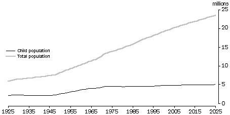 The increasing number of children The number of children in Australia more than doubled between 1925 and 1995, from 2.2 million to 4.6 million. Most of the growth occurred after World War II, from the late 1940s, through the 1950s, and to a lesser extent through the 1960s. The growth over this period started with the post-war baby boom, which has been attributed to the rapid increase in the proportion of people marrying and having children. At the same time, high levels of immigration brought additional children and young couples of child-bearing age to Australia (see Australian Social Trends 1996, Australia's population growth). Levels of fertility fell markedly during the 1960s, and by 1976 had fallen to below the level required to replace the population (2.1 children per woman). This decline, together with lower levels of immigration, has contributed to the levelling out of the child population over the last two decades. Between 1985 and 1995 the child population increased by only 2%, having declined by just over 1% over the previous decade. Some of the impact of the low level of fertility was offset by an increase in the number of children born as a result of the baby-boom generation reaching child-bearing age. This echo effect was especially evident in the early 1970s (see Australian Social Trends 1996, Trends in fertility). While the number of children has increased, the proportion of the population who are children has decreased. In 1925 children accounted for 36% of Australia's total population. By 1995, this had decreased to 26%. This trend is related to declines in levels of fertility as well as increases in the numbers of older people due to increases in longevity. These influences on the relative size of the child population are expected to continue. In 2025 children are projected to represent 21% of the total population. The relative decline in the child population is most apparent when compared with the growth of the population aged 65 years and over. Thus while the child population increased by 1% between 1975 and 1995, the population aged 65 and over increased by 78%. As well as changes in the size of the child population, the age distribution of children has fluctuated since 1925 with a consequent effect on demands for different age-related services. For example, in 1955, 33% of all children were infants or toddlers (0-4 years), 42% were of primary school age and 26% were aged 12-17. However, with declining fertility, children in the 0-4 years age group have come to represent a smaller proportion of the child population (28% in 1995). This trend has tended to shift the demands for child-related services in favour of the needs of older children. GROWTH OF THE CHILD POPULATION