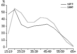 Source: Labour Force Survey Demographic characteristics The majority of part-time workers (75% in 1993) are women and the increasing participation of women in the labour force has been one of the major factors on the supply side of the labour market associated with the increase in part-time employment. The female labour force participation rate increased 10 percentage points between 1973 and 1993, rising from 41% to 51%. Over 90% of the increase was due to an increase in participation in the part-time labour market. Increasingly women are combining work with family responsibilities and part-time work provides an important means of achieving this. In 1993 the incidence of part-time work was highest among married women at 47% compared to 35% for unmarried women. The incidence of part-time work among men in 1993 was 10%. Students are another important source of part-time labour and the increase in participation in education among 15-24 year olds, particularly through the 1980s, has been another important trend contributing to an increase in the supply of potential part-time workers (see Education - National summary tables). Participation in full-time education among 15-24 year olds increased from 25% to 38% between 1982 and 1992. Over the same period participation in the full-time labour force by 15-24 year olds declined, from 61% to 48%, while participation in the part-time labour force increased, from 11% to 21%. About 40% of the overall increase in participation in the part-time labour force between 1973 and 1993 was due to increased participation by 15-24 year olds, a large proportion of whom are students. One other group which requires special mention with respect to part-time work is older male workers, particularly those in retirement. Although men in the 55-64 year age range represented only a little over 3% of the total part-time labour force in 1993, 12% of those who were working, worked part-time, compared to 6% of men aged 25-54 years. This partly reflects the use of part-time work as a means of easing into retirement (see Early retirement among men). EDUCATION AND LABOUR FORCE PARTICIPATION OF 15-24 YEAR OLDS Source: Labour Force Survey; Survey of Transition from Education to Work. Part-time work and unemployment The fact that such a large proportion of the pool of people working or wishing to work part-time are married women and students impacts on the relationship between employment growth and unemployment. A number of researchers have argued that among these particular groups a large proportion are likely to have been outside the labour force prior to obtaining a job. Similarly, if married women or students lose their part-time jobs they are likely to leave the labour force, rather than enter the pool of unemployed for any extended period. In essence this means that many of the participants in the part-time labour market effectively bypass the unemployment pool upon entering or exiting the labour force. This has critical implications for the way in which job growth affects measured unemployment. As the mix of new jobs changes, with more jobs being part-time, the effect of overall job growth on measured unemployment is diminished. This partly explains why at the present time Australia has a high unemployment rate despite many years of high overall employment growth. Some support for this argument can be found in the fact that increases in part-time work have corresponded with increases in participation in the labour force by women, particularly married women, and students. Some support can also be found in the fact that in 1992, 67% of people outside the labour force who wanted to work said they would prefer a part-time job. Moreover, 64% of discouraged jobseekers i.e. people who had left the labour force because they could not find a job, also said they would prefer part-time work. At the same time only 14% of the people who were unemployed said they were looking for part-time rather than full-time work. Underemployment The majority of people working part-time do so by choice. Nevertheless, with the growth in unemployment in recent years the number of people working part-time who would prefer more hours has been increasing, as has the number of full-time workers forced to work part-time hours because of lack of work. Combined, these two groups of workers comprise the underemployed. In 1993, 580,000 people were underemployed, a slight decline from the previous year. The underemployment rate (underemployed expressed as a percentage of the labour force) was 7%. About 12% of the underemployed were full-time workers stood down or on short time because of insufficient work. The remainder, just over half a million, were part-time workers. Of these, 186,000 (36%) had actively looked for full-time work in the four weeks prior to the survey. The half million underemployed part-time workers represented 28% of all part-time workers in 1993. 62% of underemployed part-time workers were women compared to 75% of all part-time workers. The highest incidence of underemployment among male part-time workers was in the 25-34 years age group of whom 60% wanted to work more hours. The highest incidence of underemployment among women was 43% in the 20-24 years age group. Overall, 44% of male part-time workers were underemployed compared to 23% of female part-time workers. UNDEREMPLOYMENT AND UNEMPLOYMENT RATES Source: Labour Force Survey; Survey of Transition from Education to Work. TOTAL AND UNDEREMPLOYED PART-TIME WORKERS, AUGUST 1993