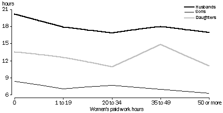 The double burden With the increasing participation of married women in the paid labour force, the question arises as to how they combine paid and unpaid work and whether they carry a double burden. In order to assess the extent to which other family members increase their hours of unpaid work in support of married women's labour force activity, the average amount of unpaid work of husbands and adult children has been examined for different categories of women's hours of paid work. While some fluctuations are evident, in general there is a slight trend downwards suggesting that, on average, the amount of unpaid work of other family members tends to decrease rather than increase as women's paid work increases. The one exception is in the move from part-time to full-time work when both husbands and daughters increased their unpaid work hours. On the other hand, sons did more unpaid work when their mothers worked part-time. On average, husbands' unpaid work time was 50% greater than daughters' living at home and 100% greater than sons' living at home. When all other relevant factors, such as life- cycle stage, the presence of children and the age of the youngest child, are held constant, a wife's hours of paid employment have only a weak effect on her husband's weekly hours of unpaid work. Everything else being equal, the husband of a woman moving from no employment to long hours of full-time employment (over 50 hours a week) would undertake an extra three and a quarter hours of unpaid work a week. Men's own hours of paid work and the presence of pre-school age children have the most influence on husbands' hours of unpaid work. A move into the labour force does not mean that the hours of paid employment can simply be added to the domestic load of women who are not in the labour force. While the total paid and unpaid work of these women is higher than that of a full-time housewife, there is a reduction in the amount of unpaid work done. When all other factors such as age, income, numbers of children and age of youngest child are held constant, there is a significant reduction in the time devoted to unpaid work. The rate of this reduction for cooking, laundry and cleaning, all other things being equal, is estimated at about five and a half hours a week for a woman working 40 hours a week. However, this reduction is not because others in the household have increased their amount of unpaid household work substantially to compensate. Rather, some of the work is either not being done or market substitutes have been made, for example with child care, cleaning, ironing, meals out etc. As well as the reduction in the amount of unpaid household work that takes place when married women enter into full-time employment, there is a question of whether the allocation of tasks changes. When the segregation of unpaid work tasks is examined for full-time employed married couples with children under 15 years, a similar pattern is observed as in the population as a whole, although men spent more time in the physical care of their own children. It would appear that women's move into the full-time labour force has not impacted greatly on role stereotypes in the allocation of unpaid work tasks. Again part of the explanation for the extent of segregation observed relates to the constraint on time availability imposed by men's paid work commitments. Even among full-time workers, Time Use Survey data indicate that married men with children spent 52% more time on full-time paid work than did their full-time employed wives (51 hours a week compared to 33 hours a week). CONTRIBUTION OF FAMILY MEMBERS AGED 15 YEARS AND OVER TO UNPAID HOUSEHOLD WORK, 1992 Source: Time Use Survey AVERAGE WEEKLY TIME SPENT ON SELECTED ACTIVITIES BY FULL-TIME EMPLOYED MARRIED COUPLES WITH CHILDREN, 1992