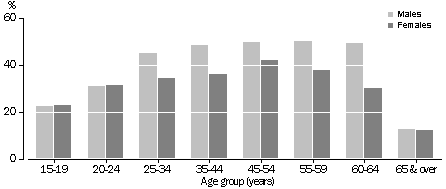 (b) Union membership rates by size of location were not collected in 1986. Sources: Survey of Trade Union Members; Business Register Sex and age structure Trade union membership rates show marked variation by age and sex. In 1992, 35% of female employees were members of trade unions compared to 43% of male employees. Similarly younger employees had lower rates of trade union membership than older employees, 23% of those aged 15-19 years compared to 46% of those aged 45-59 years. It is not clear whether this pattern is related specifically to age or sex or to the fact that women and younger workers tend to be concentrated in lowly unionised industries and occupations, and in part-time and casual jobs. The increases in the employment share of women between 1986 and 1992 may have had some negative effect on aggregate trade unionisation levels while the decrease in employment share of younger workers may have had a positive effect. TRADE UNION MEMBERSHIP RATES, 1992 Source: Survey of Trade Union Members Total effect of compositional change One method of quantifying the effects of compositional change on trade union membership is to recalculate aggregate rates while holding compositional elements constant. The resulting standardised estimates can then be compared to the actual rates to gain some idea of the effect that might be attributed to the change in composition3. Results indicate that, individually, the changes in job status, industry and sectoral composition of the labour force accounted for about a quarter of the decline in trade union membership between 1986 and 1992. Changes in occupation mix and size of employment location each accounted for 10-11% of the decline. The increase in the proportion of female employees had only a small effect on trade union membership accounting for 5% of the decline. Age structure change on its own had the only positive effect on trade union membership rates. It should be noted that these effects are not additive due to the fact that the various categories are not mutually exclusive and strong correlations exist between the variables. This problem could be eliminated by holding all relevant variables constant simultaneously but the data do not allow sufficient disaggregation for this. However, it seems likely that if all variables were taken into account, well over 30% of the decline in trade union membership could be explained by compositional change4. FACTOR STANDARDISED(a) TRADE UNION MEMBERSHIP RATE
