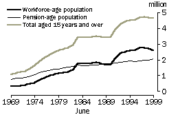 Increase in workforce-age recipients of income support For most of the 20th century, the majority of income support recipients were of ‘pension age’ (men aged 65 years and over and women aged 60 years and over) and receiving either an age pension or a veteran's service pension. However, during the last three decades the balance changed, as a result of the strong growth in the numbers of income support recipients of ‘workforce-age’ (men aged 15-64 years and women aged 15-59 years), particularly during the periods of economic downturn in the early 1980s and early 1990s. NUMBER OF INCOME SUPPORT RECIPIENTS Source: Department of Family and Community Services, Income Support Numbers and Expenditure, 1901-1999 Database; Population by Age and Sex, Australian States and Territories (ABS cat. no. 3201.0). Between 1969 and 1999, the number of Australians receiving income support payments increased from 1.1 million to 4.7 million. Almost two thirds (2.3 million) of this increase was among the workforce-age population. The proportion of the workforce-age population receiving income support increased considerably from 4% to 21% during the period. This increase is largely associated with: sustained declines in full-time employment and increased levels of unemployment, particularly among young people and those just below retirement age; increasing proportions of people without partners in general, and lone parents in particular; and increasing levels of education participation among young people. These social changes have impacted differently on men and women, and while both have had similar overall increases in the take-up of income support payments, there are some key differences in the types of payments taken up.