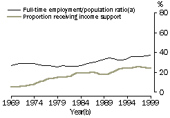 For example, the increase in the proportion of workforce-age men receiving income support payments is primarily associated with the decline in rates of full-time employment (seeAustralian Social Trends 2001, Trends in employment population ratios). Between 1969 and 1999, the proportion of workforce-age men who were unemployed or working part-time, and receiving unemployment payments, increased from less than 1% to 8%, accounting for almost half of the overall increase (from 4% to 19%) in workforce-age men receiving income support. In addition, the proportion of workforce-age men who were unable to work, and were receiving disability or sickness payments, increased from 2% to 6%, accounting for more than a quarter of the overall increase between 1969 and 1999. PROPORTION OF WORKFORCE-AGE POPULATION RECEIVING INCOME SUPPORT PAYMENTS